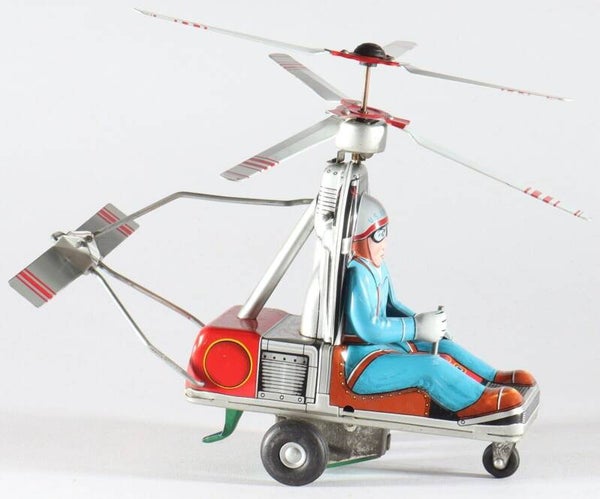 Lithographed tin Gyrodyne.Working friction, rotors turn while driving.Excellent condition, litho has bright colors.Marked HAJI made in Japan.20x18cm (8x7,5 Inches)