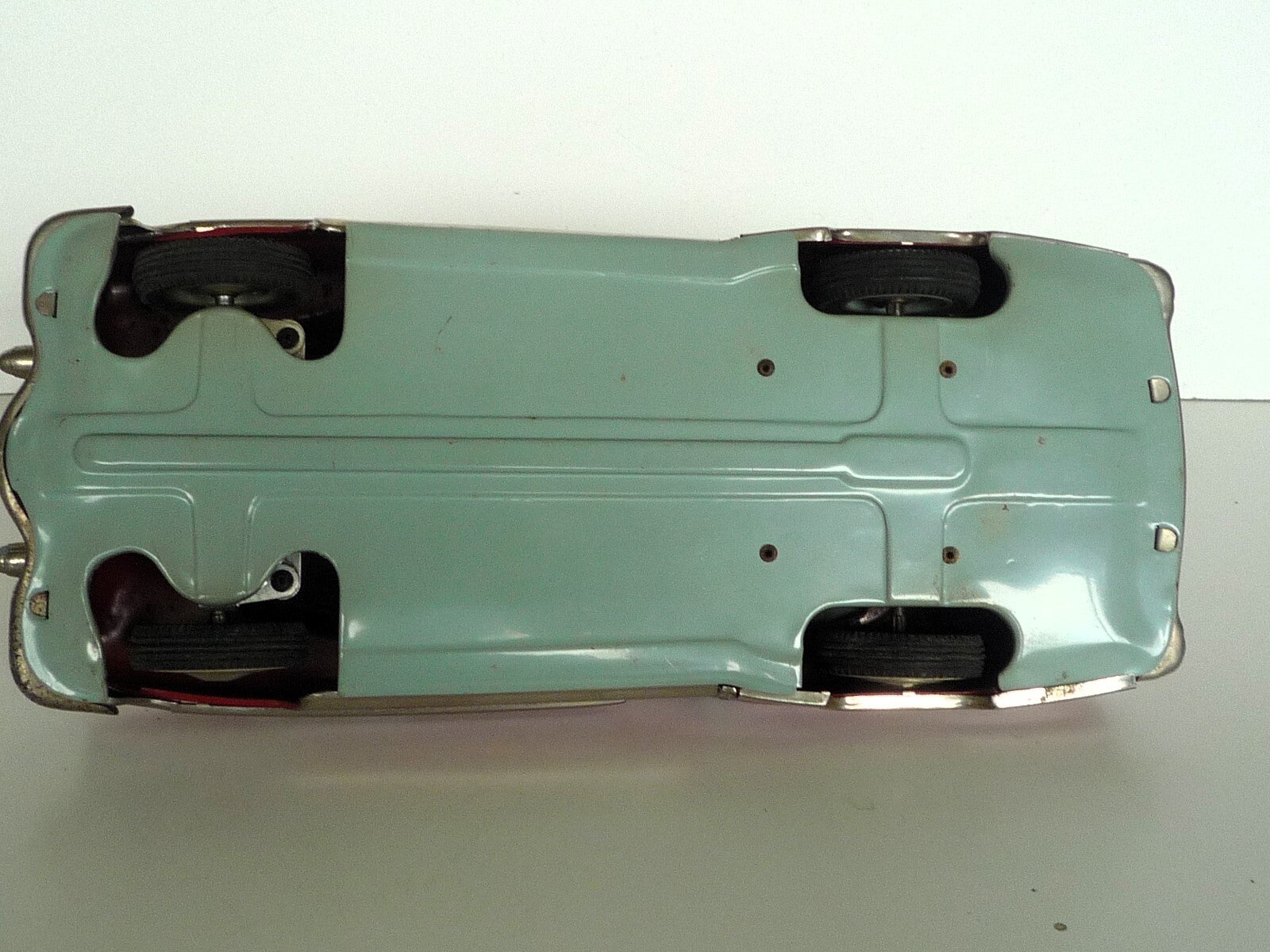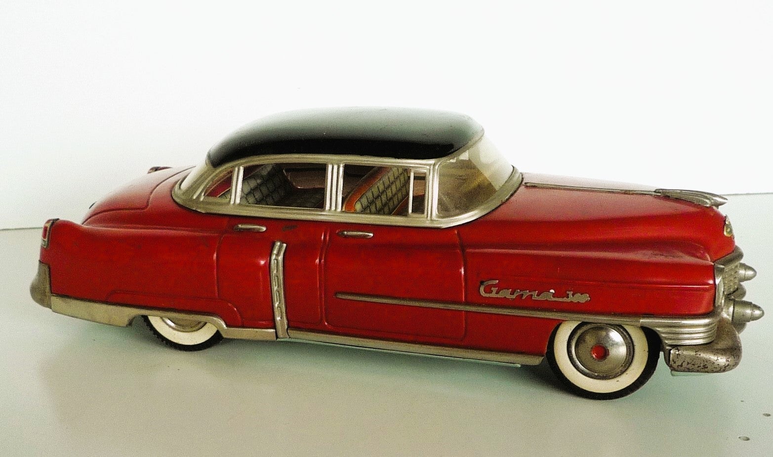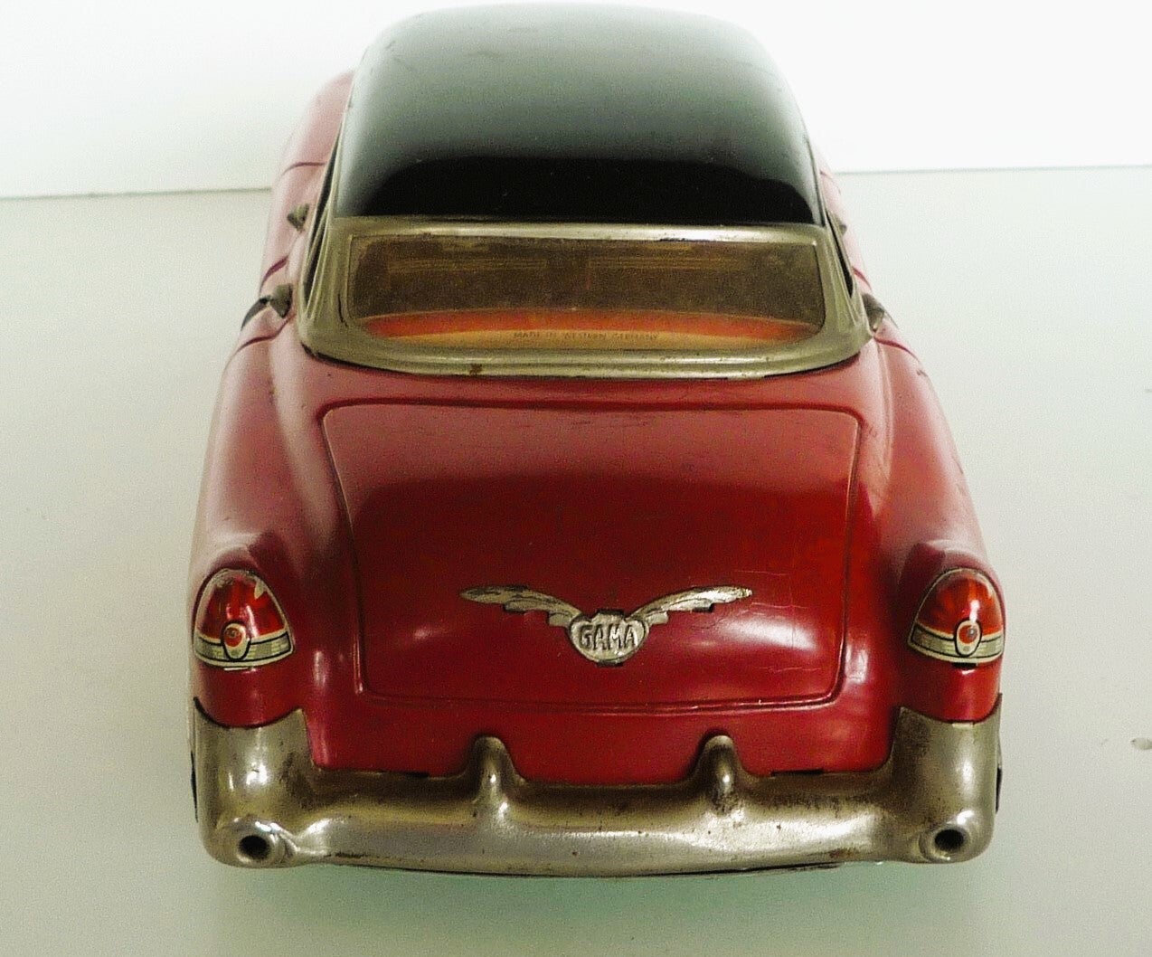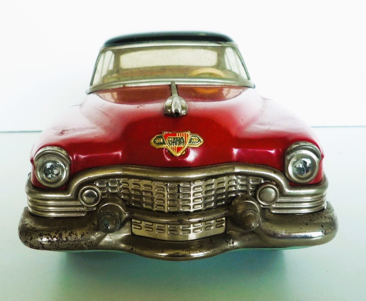 This is a 1954 GAMA-300, friction powered CADILLAC CAR. Has a Red Body with Black Roof, Lithograph Interior,