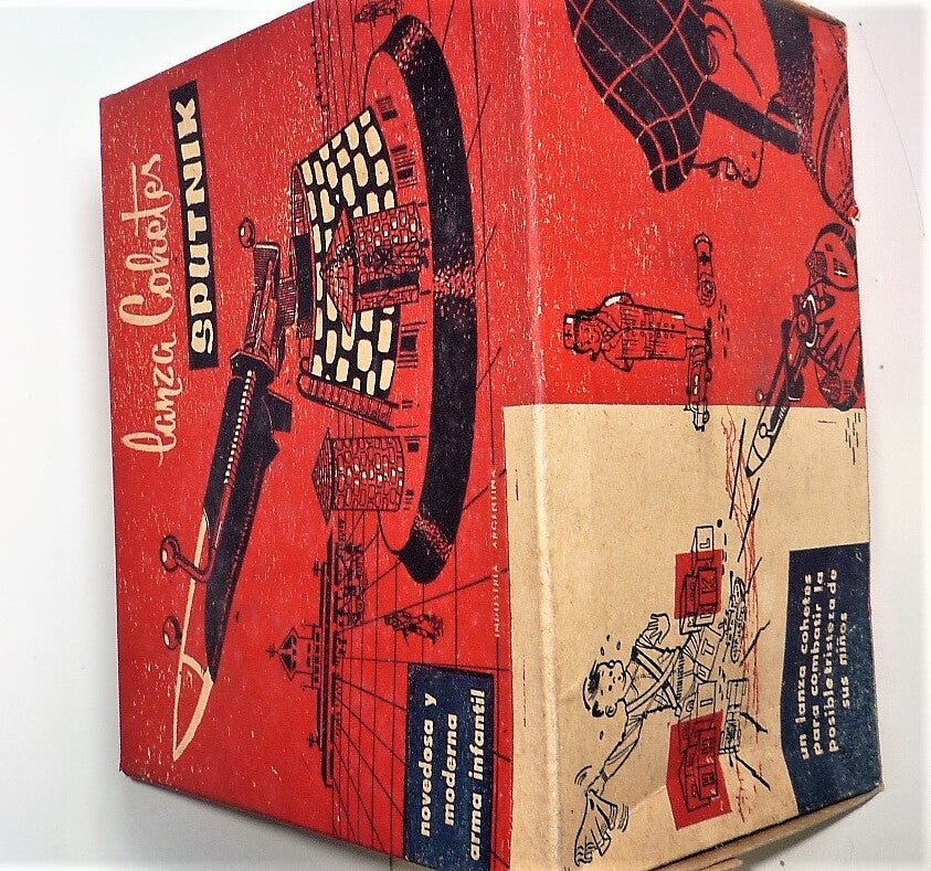 Ansa "SPUTNIK" ROCKET LAUNCHER tin toy 1950s Lithographed tin.Original box, Diam. base 19cm (7,5 Inches)Made in Argentina by Ansa.Excellent condition.