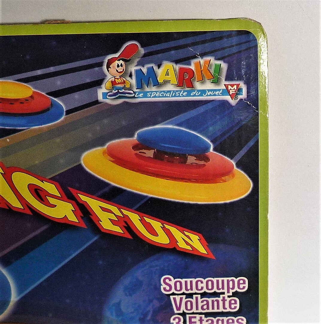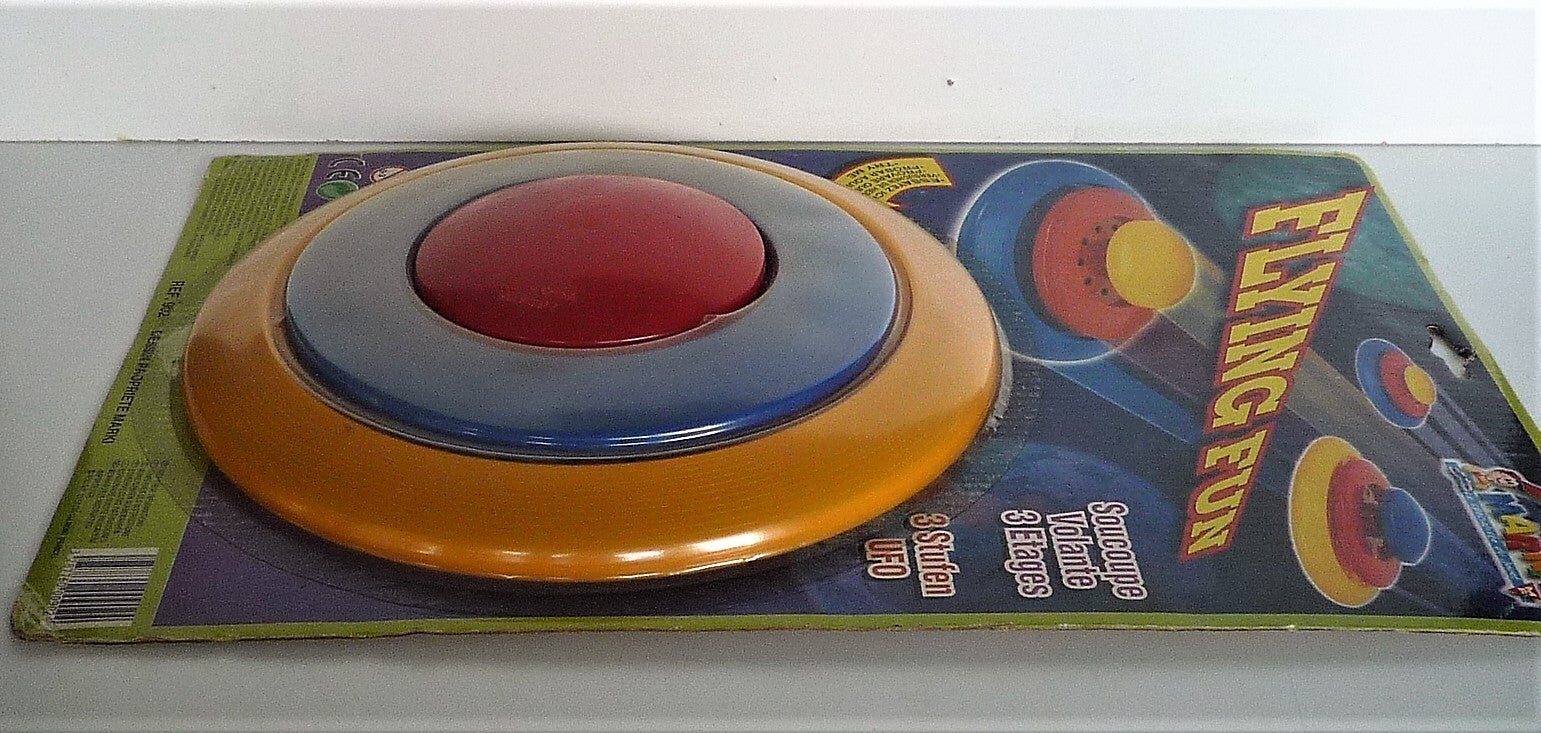Space Frisbee "Flying Fun" from Marki 1980's When floating, two parts of the frisbee rise up and form a flying saucer.Never used, still packed.D=21cm (8,5 Inches)