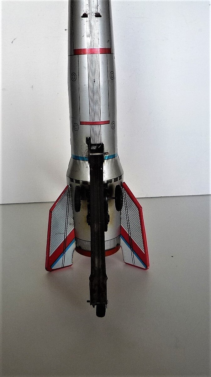 Rocket, made in USSR.Tin rocket with astronaut.When the rocket hits the wall, it straightens up and the astronaut appears.Original and working.Incl. cardboard box.L=40cm (15.5 Inches)