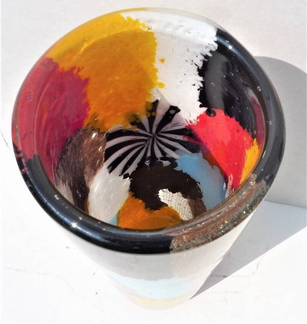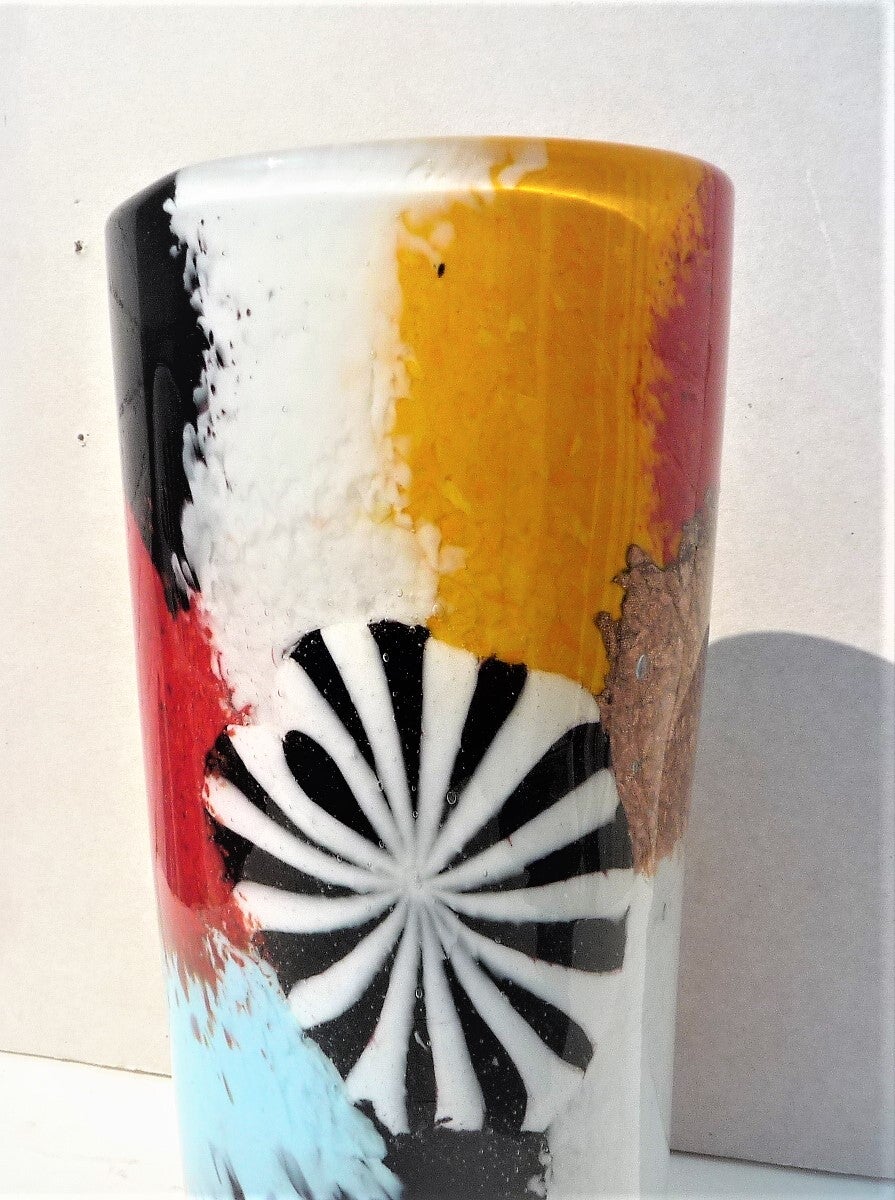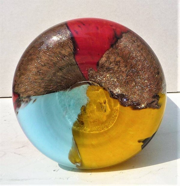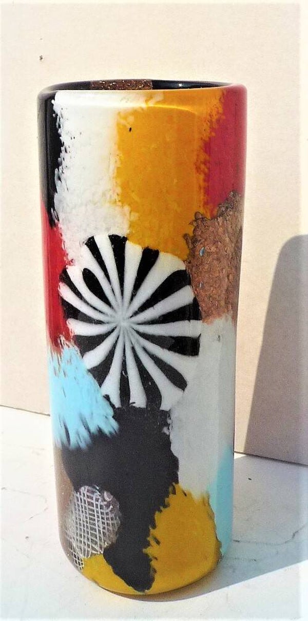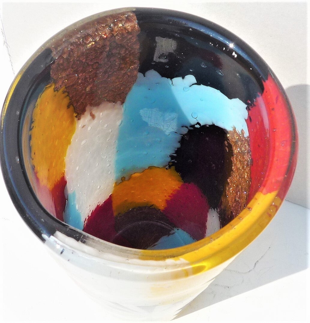 Internally decorated polychrome patchwork glass with copper inclusions, pinwheel and filigrana.