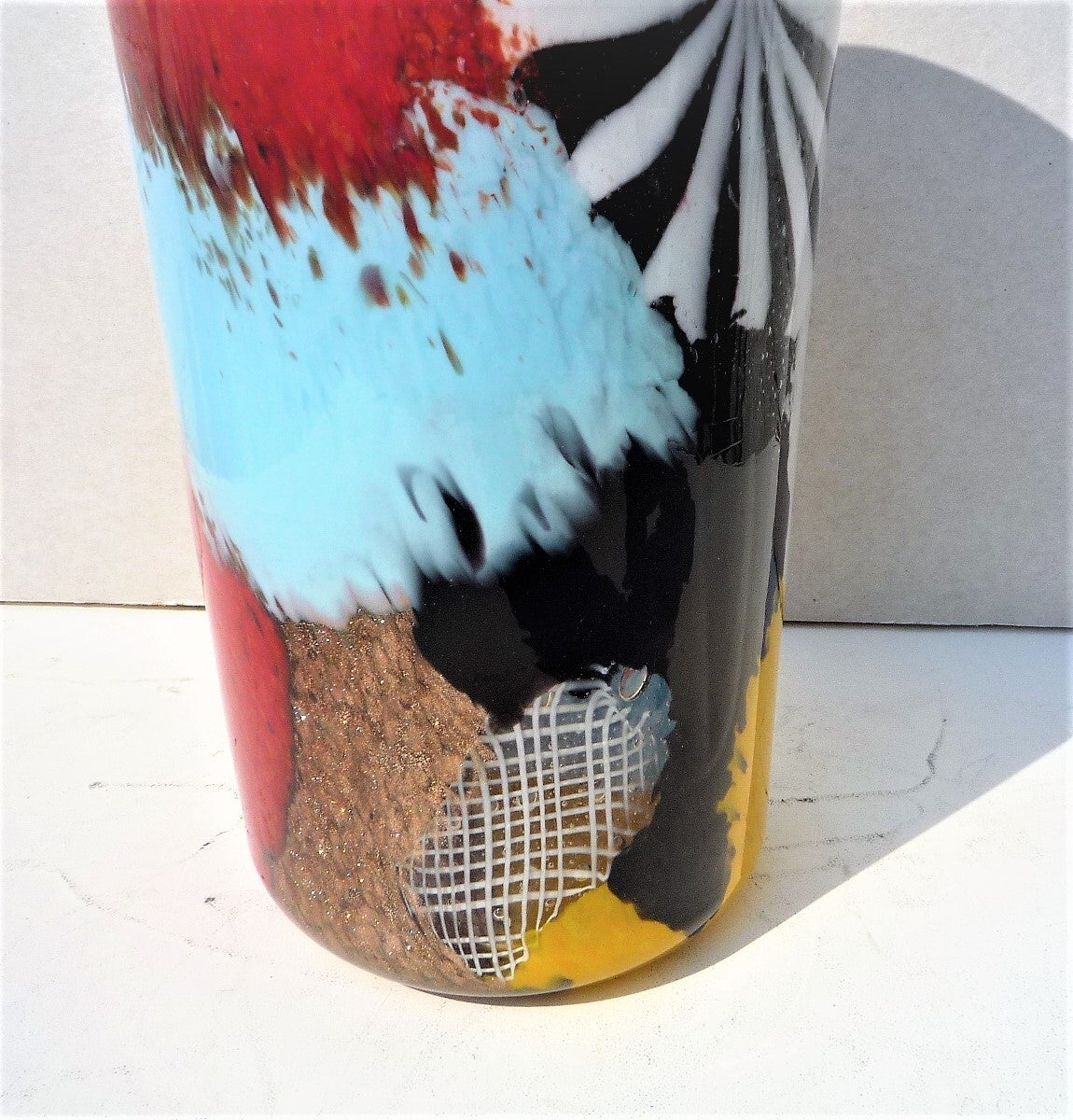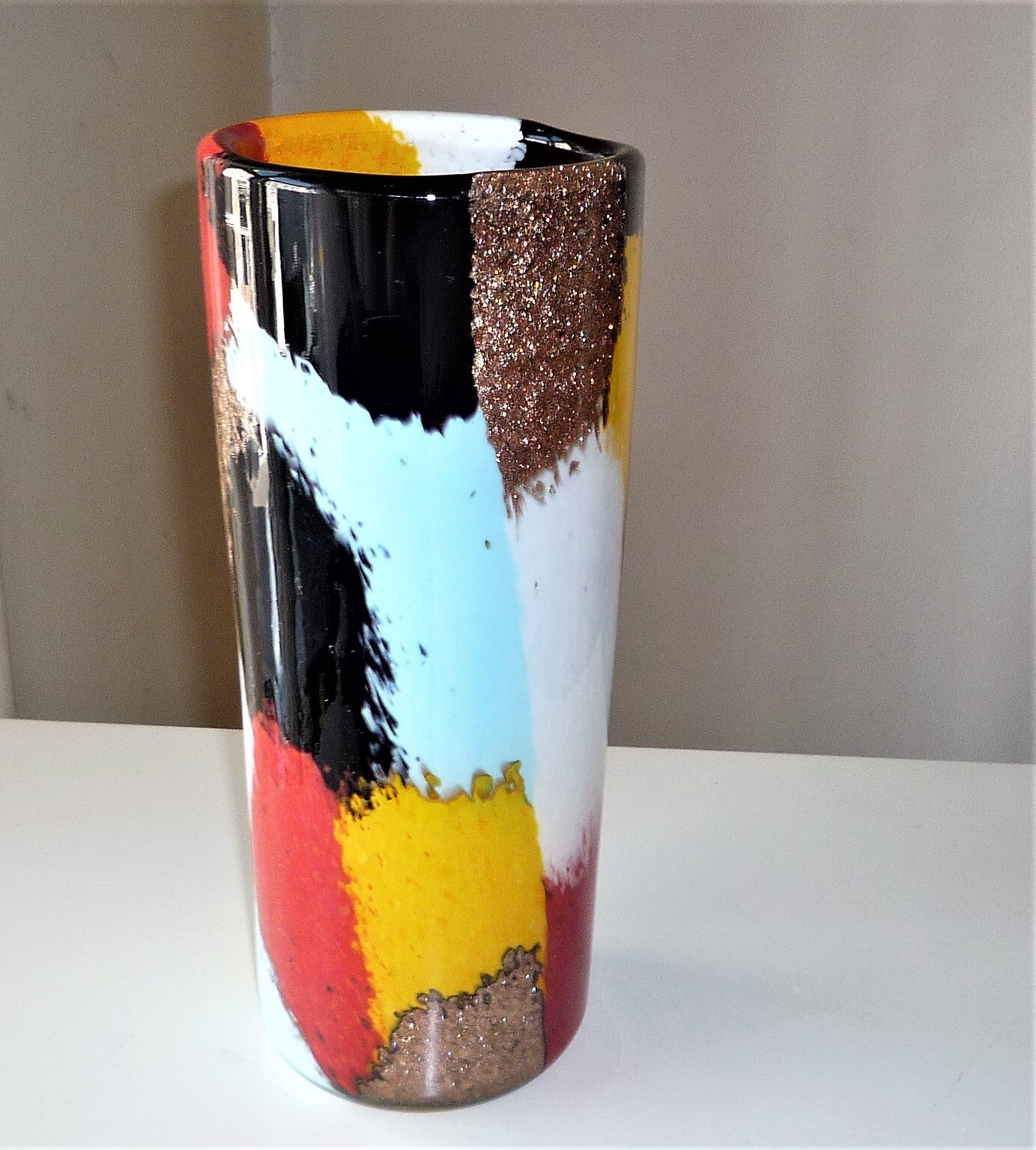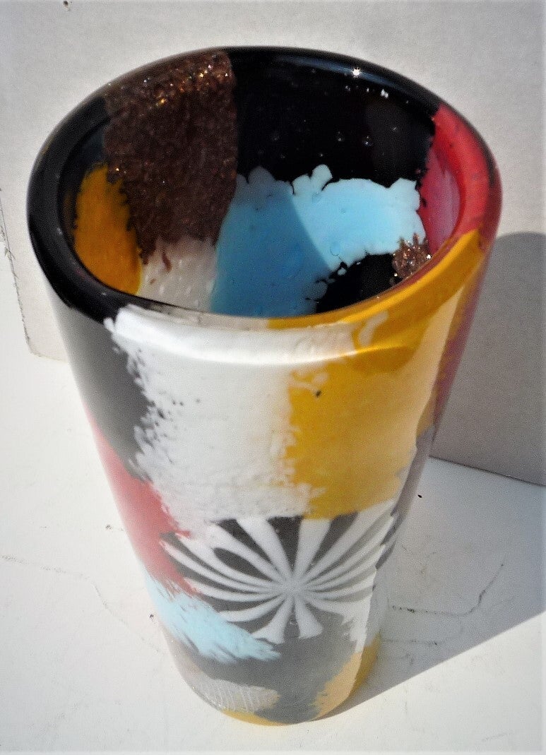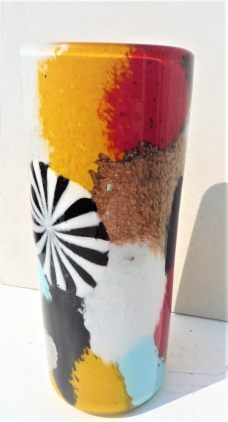 Internally decorated polychrome patchwork glass with copper inclusions, pinwheel and filigrana.