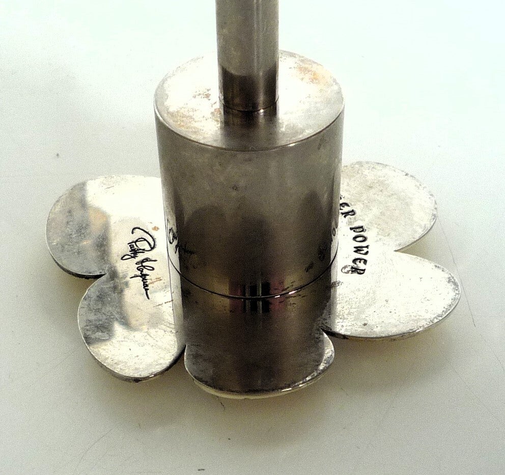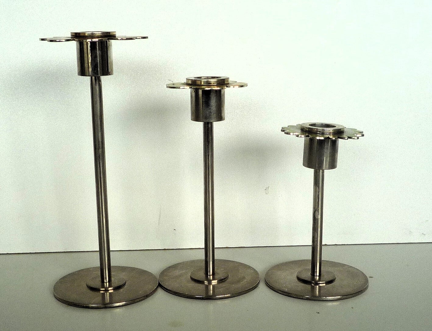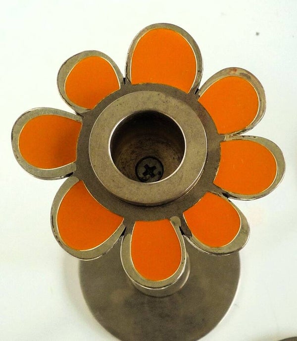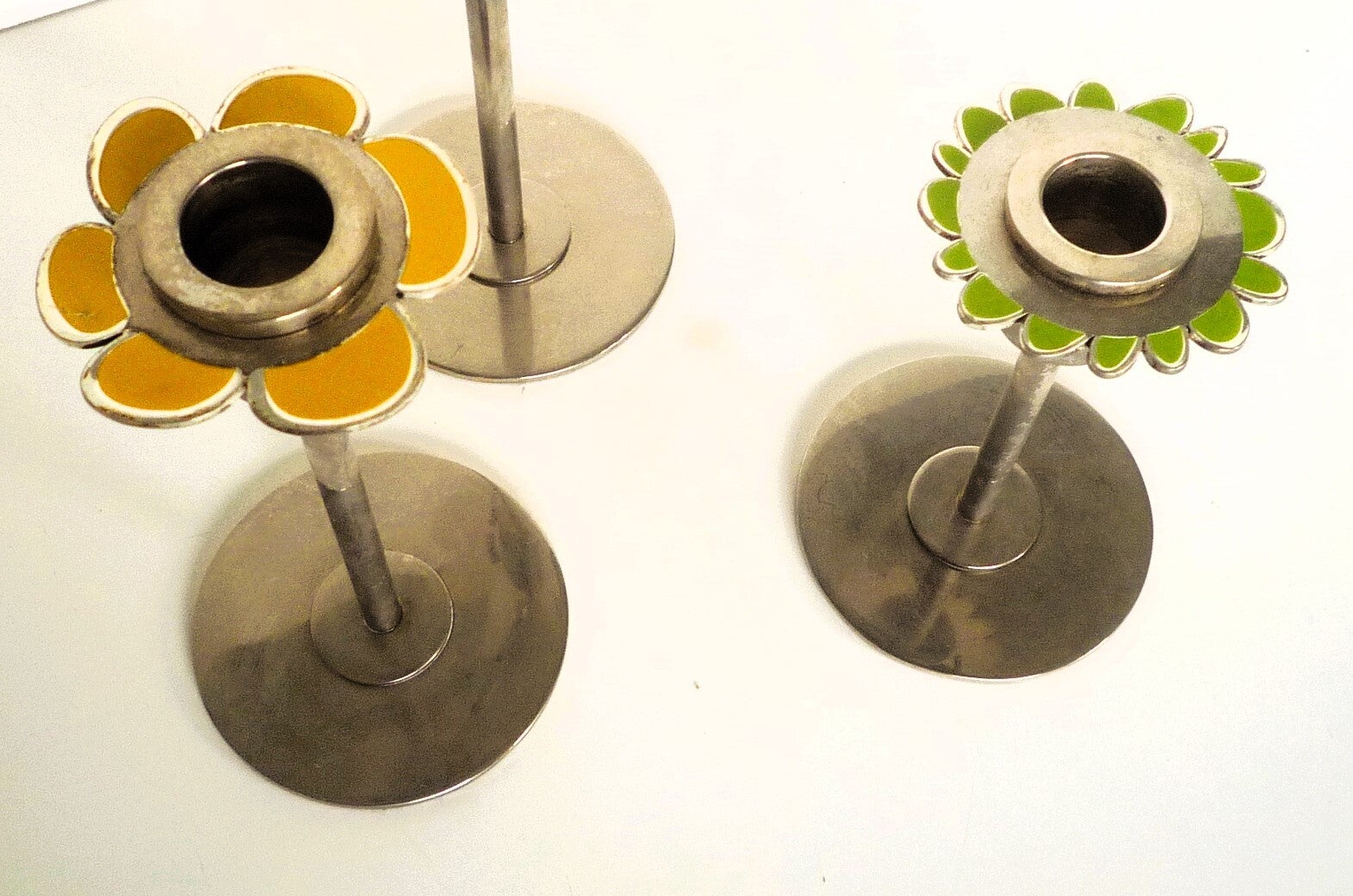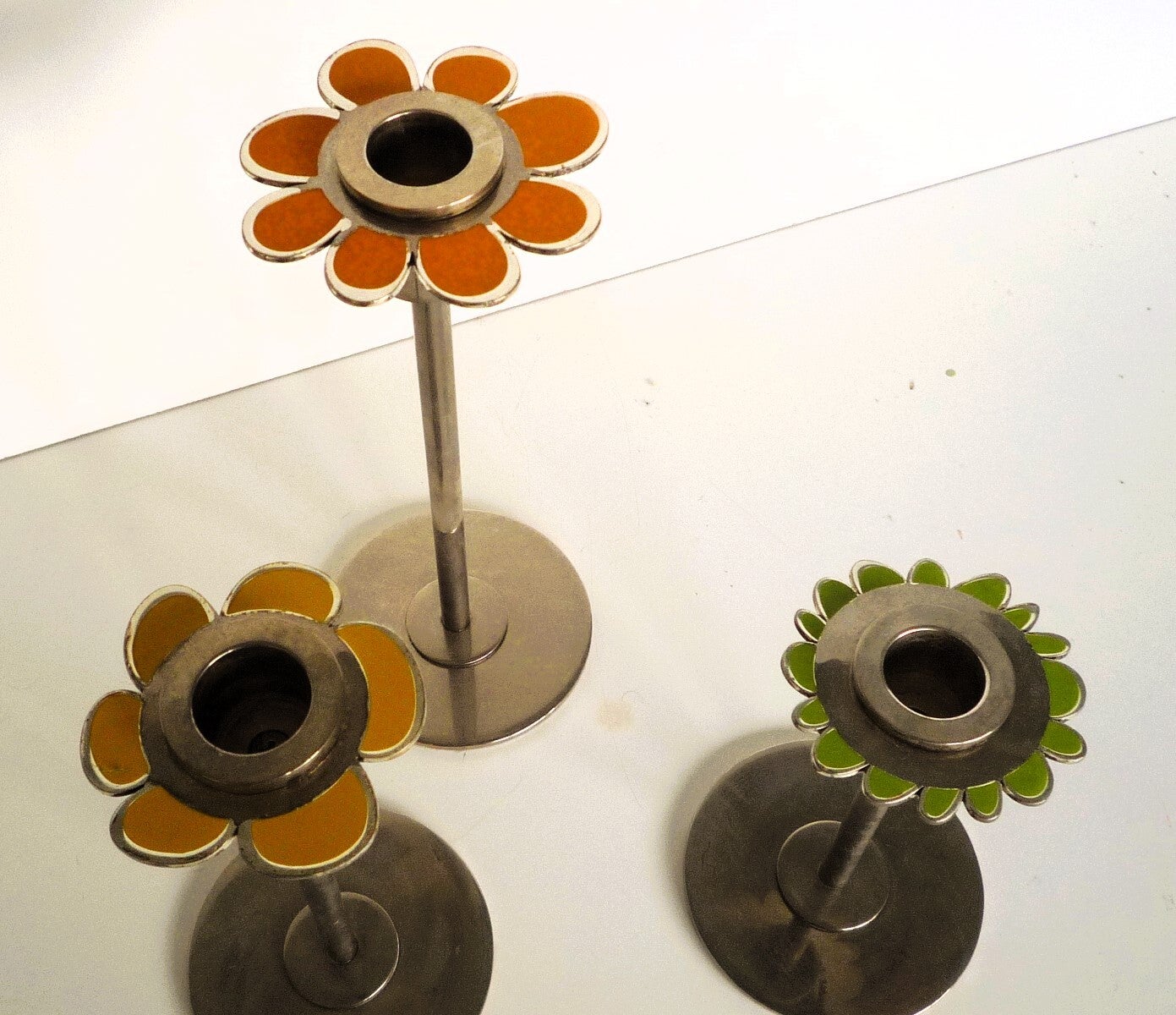 Patty Harpenau Candlesticks "Power Flower" Three stainless steel candlesticks with an enamel decoration of flowers.Signed and marked "Power flower" Fabr. Gero.H=19, 15 and 12cm (7.5 6 and 5 Inches)Great condition.