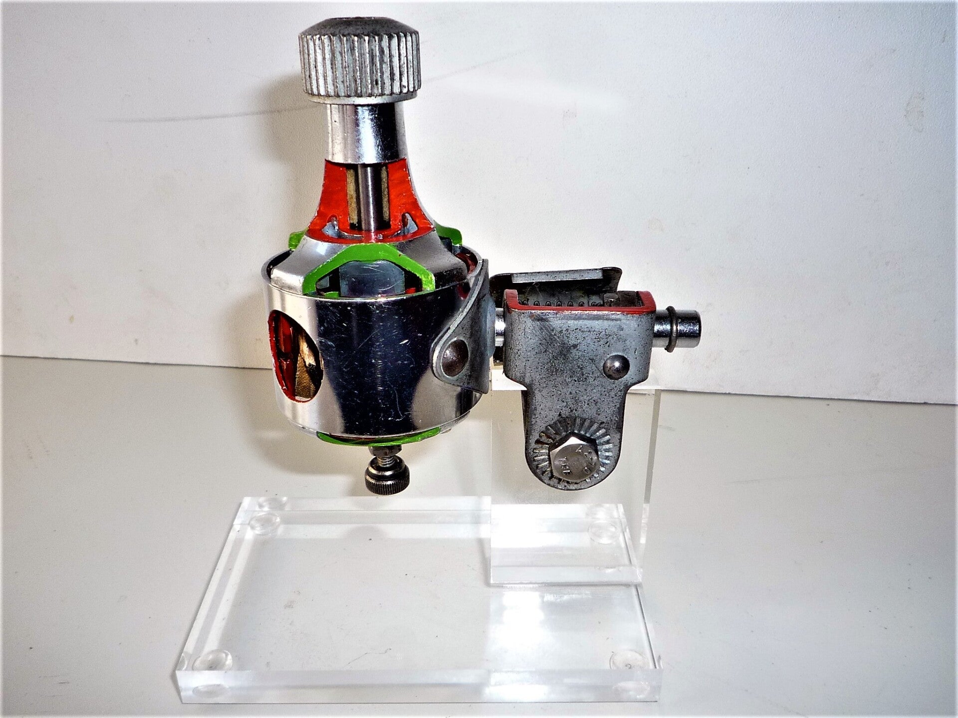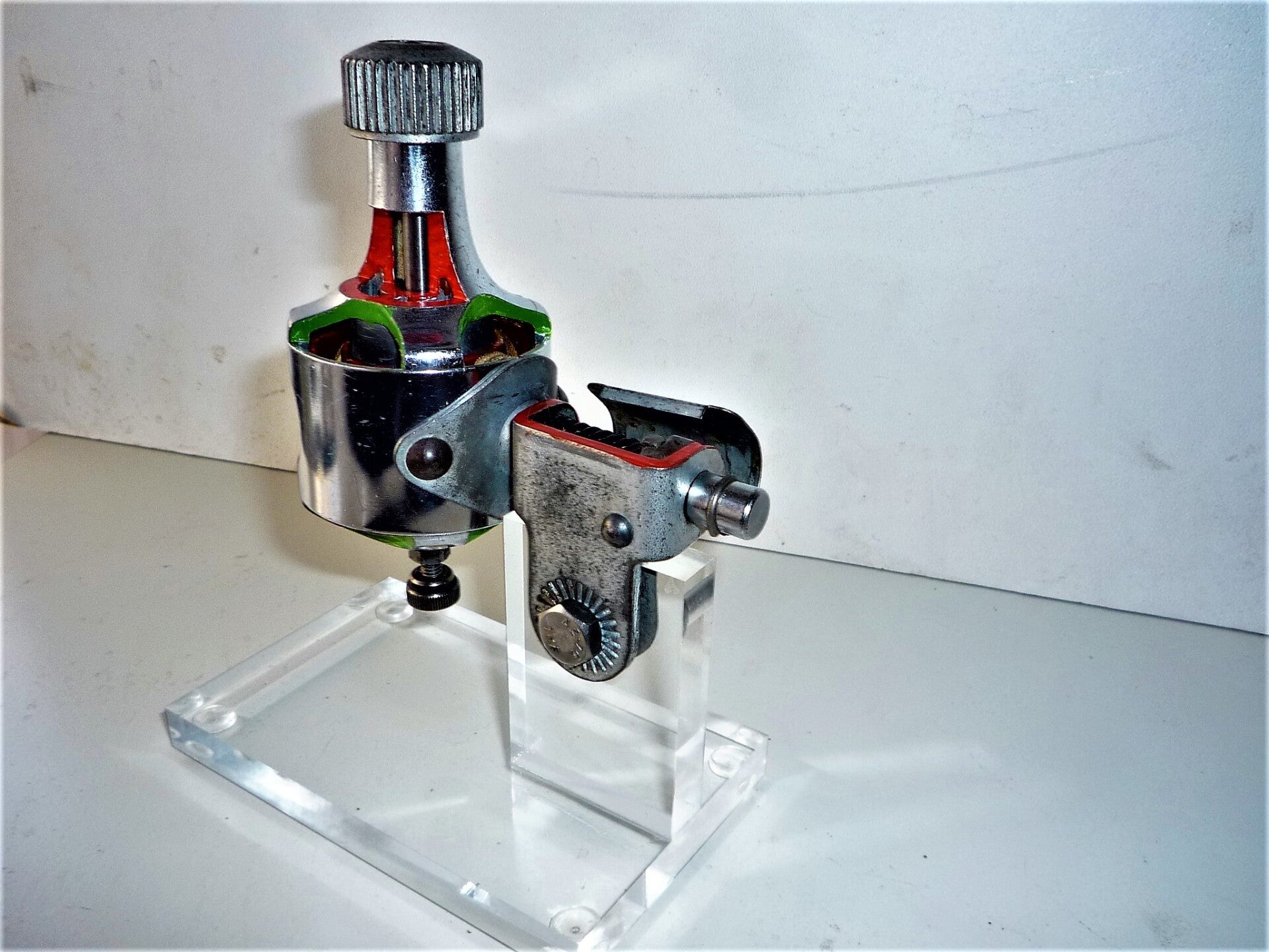 Cutaway model of a bicycle dynamo, mounted on a perspex display.Used in Technical schools 1950.Stator and magnet rotor clearly visible.H=13.5cm Base=6x10cm. (H=5.5 Inches Base=2.5x4 Inches)